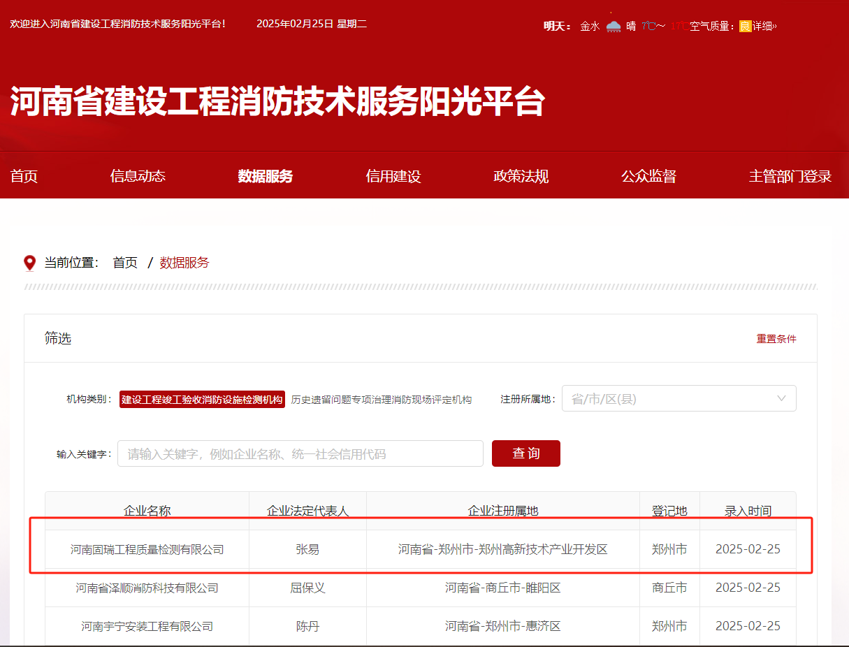 熱烈祝賀河南固瑞工程質(zhì)量檢測有限公司入冊(cè)河南省建設(shè)工程消防技術(shù)服務(wù)陽光平臺(tái)!!!
